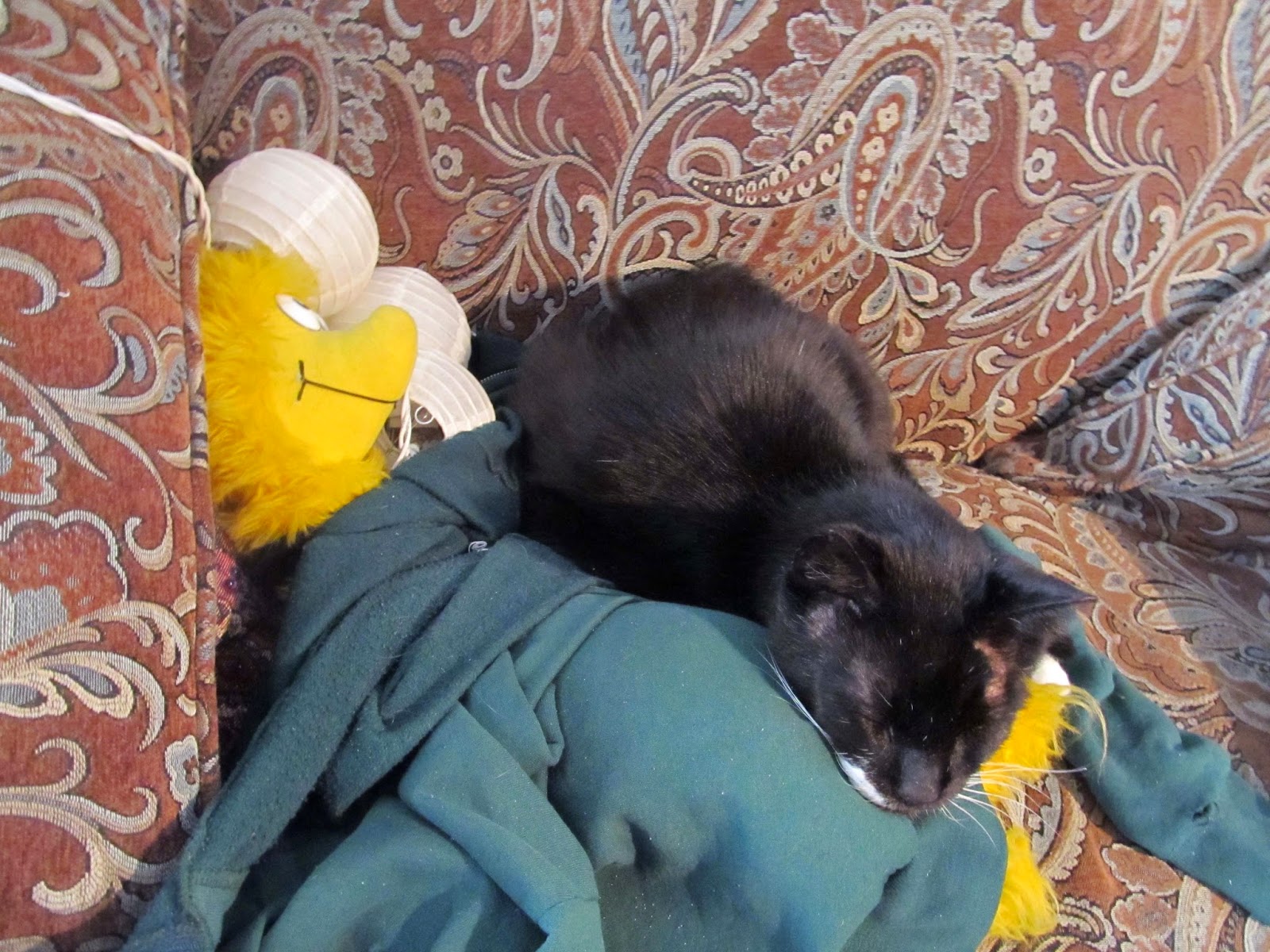 That’s my traction.At right is the former feral, now mondo schmooze beast, Rocco sacked out on the couch with Miles’ old Sneetch. That’s The Amazing Bob’s hoodie underneath him. Yep, TAB understands that it’s now Rocco’s hoodie. Good thing I bought him a new one recently. By the by, Rocco, like Coco, seems to enjoy watching cowboy movies with TAB.
